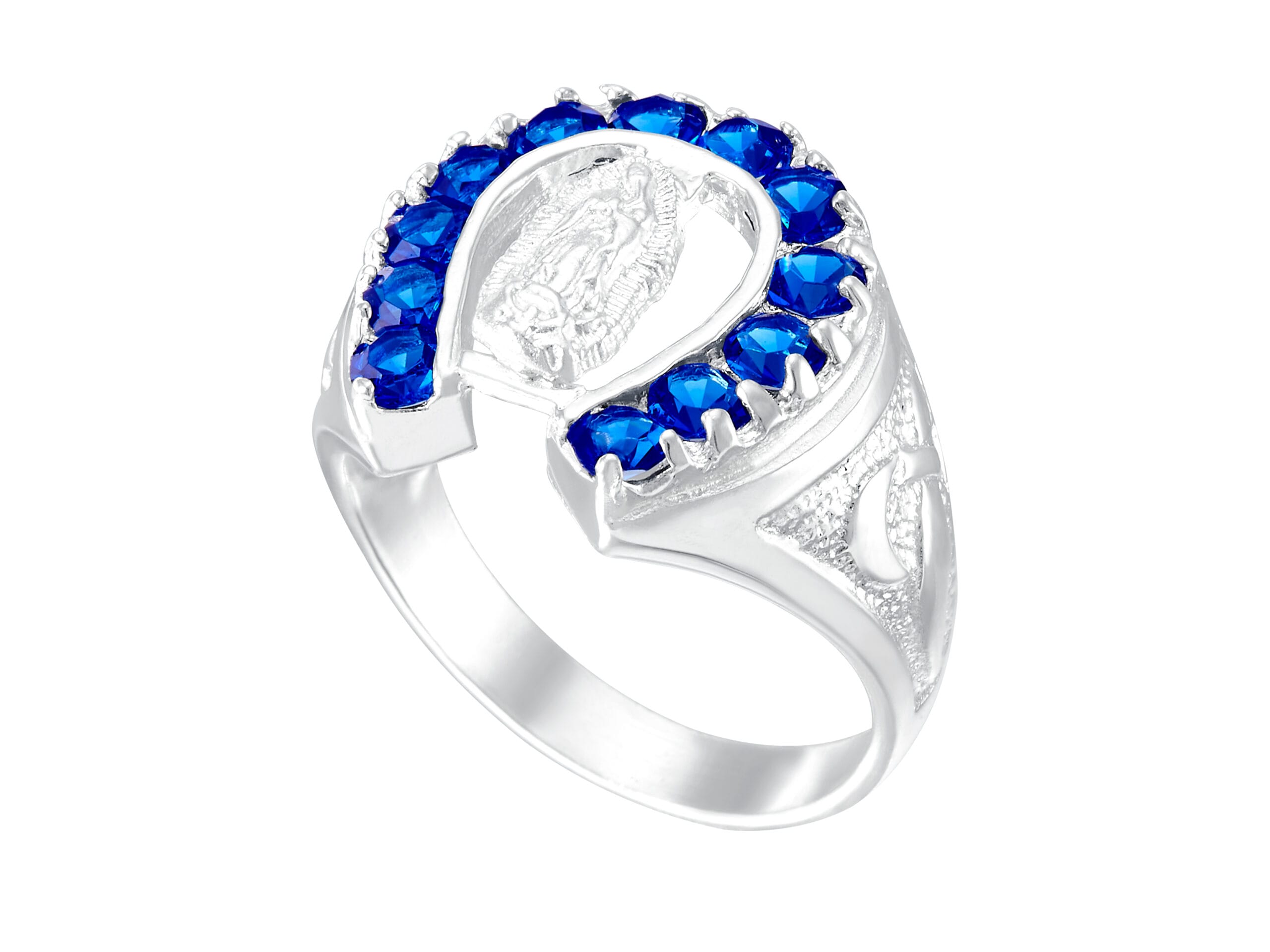 Anillo Herradura Zirconias Azul Rey y Virgen de Guadalupe