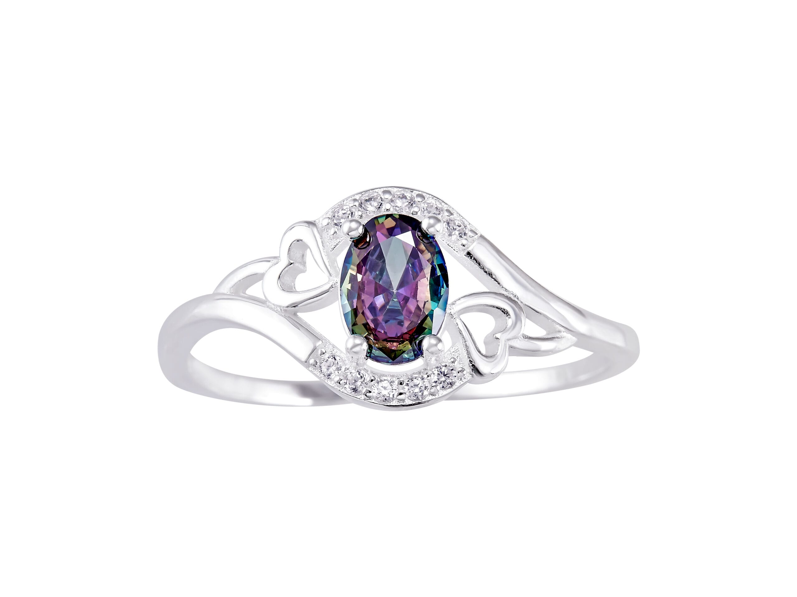 Anillo Ovalo Tornasol y Corazones Laterales