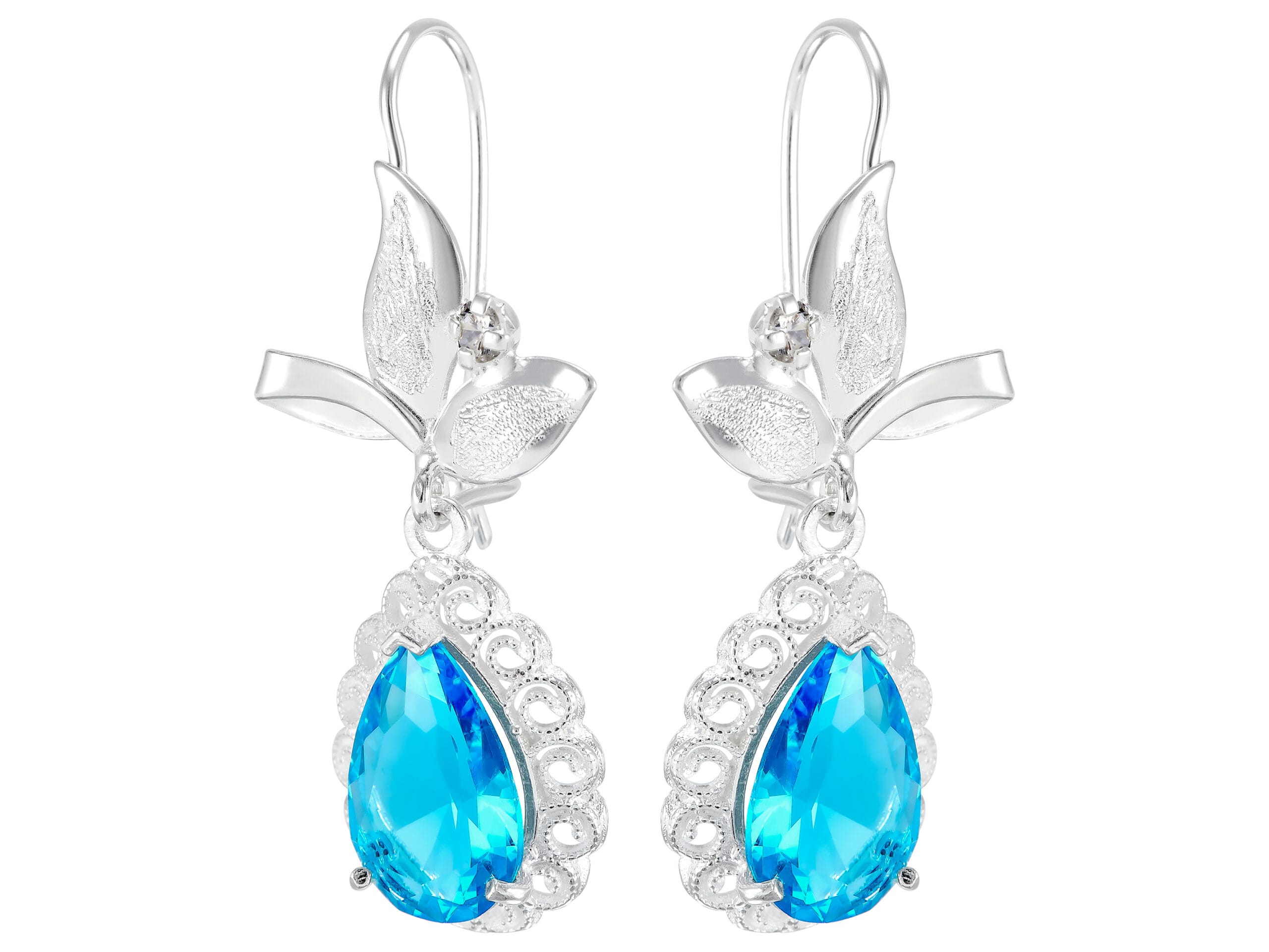 Aretes Hoja Diamantado y Gota Azul Colgante